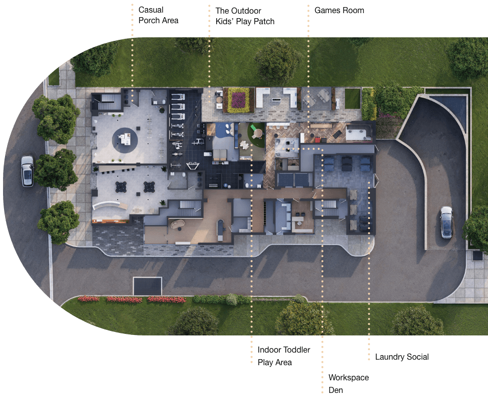 Designed with daily life in mind, the Workspace Den gives parents a place to stay productive while keeping an eye on their little ones, or while waiting on the laundry. Nearby, the Laundry Social turns everyday tasks into shared experiences, making space for simple moments of connection.